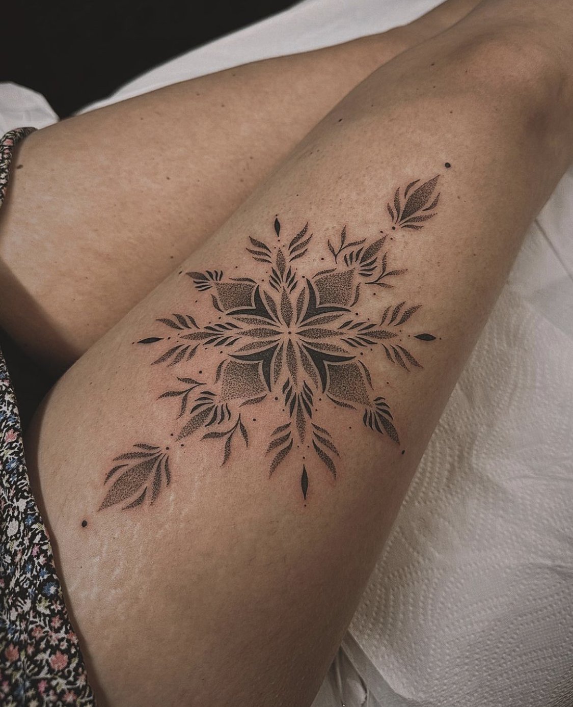 Sunnie has been part of our team for almost 2 years, bringing a calm, thoughtful presence to the studio. Her decorative and ornamental tattooing style is beautifully intricate, adding a unique touch to every design she creates, As well as tattooing with a machine, Sunnie also enjoys doing handpoked tattoos.